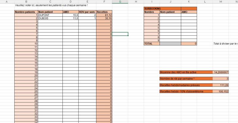 Ce tableau vous permet de lister tous vos patients, de noter leur AMO et le nombre de fois que vous les recevez par semaine, afin de calculer automatiquement :